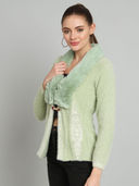 Experience comfort in style with this green cardigan from Broowl. Made from high-quality wool, the cardigan features full sleeves, a collar neck and a self design pattern. Style it with denim, minimal jewellery and sandals to complete the ensemble.