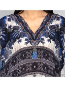 Level up your wardrobe with this must have white and blue porcelain print kaftan top embellished with crystals and finished with white fringe at the hem.