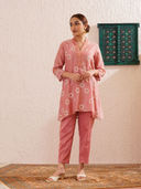 Flaunt your grace with this pink co-ord set from OMI. Made from high-quality chanderi, the tunic features three fourth sleeves, a v-neck and a printed pattern. It is paired with a mid-waisted pant and a slip. Style it with minimal jewellery and sandals to complete the ensemble.