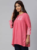 Adorn yourself in the ethnic grace with this pink kurti by Readiprint Fashions. Made with high quality viscose, it features button fly closure and geometric pattern along with three fourth sleeves & tie up neck. Style it with jewELLEry and sandals complete the look.