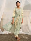 Shop from an exclusive range of Ava collection. Bring home block printed with all over floral and buti motifs festive wear in colors inspired by nature. . Features A-Line silhouette with front slit.This elegant outfit is a complete set comes along with a bottom and dupatta complimenting each other perfectly.