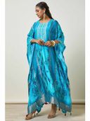 Women Blue Brocade Floral Kaftan with Beads and Stones (Set of 2)