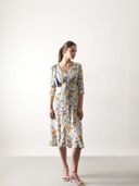 Elevate Your Wardrobe with This Elegant White Midi Dress. Featuring An Overall Print, 3/4 Sleeves, and A Flattering V-Neckline, It's Designed for Effortless Sophistication. The Front Slit Adds A Touch Of Grace, Making It Perfect for Any Occasion.