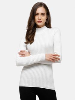 Women Cream Turtle Neck Striped Slim Pullover Sweater