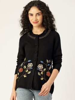 Women Wine Embroidered Front Pocket Sleeveless Cardigan
