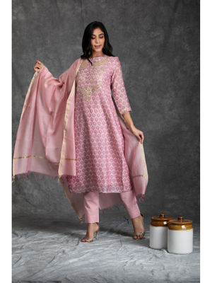Old Rose Pink Embroidered Chanderi Kurta With Pant And Dupatta