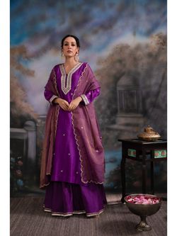 Purple Embroidered Chanderi Silk Kurta with Pant and Organza Dupatta (Set of 3)