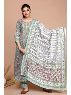 Women Cotton Festive Kurta with Flared Palazzo & Dupatta (Set of 3)