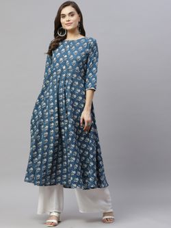 Womens Plus Size Navy Blue Printed Angrakha Kurta