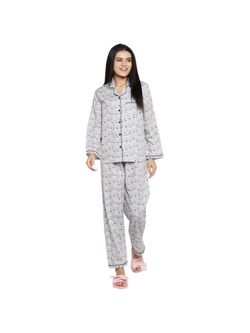 Premium Cotton-Flannel Print Long Sleeve Women's Night Suit | Lounge Wear - Grey