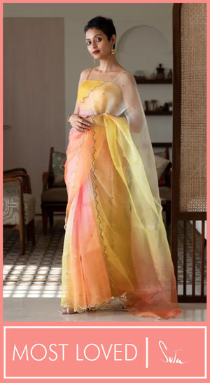 The brand uses azo-free dyes for all its sarees. They are a sustainable alternative to traditional synthetic dyes that promise enhanced colour-fastness. It keeps your sarees looking fresh and vibrant.