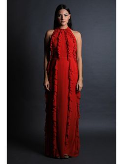 Backless Tie Halter Neck Gown With Frilled Hem And Full Balloon Sleeves
