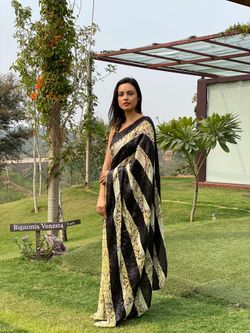 Black Printed & Solid Half & Half Saree With Stitched Blouse