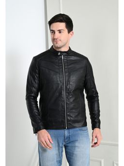 Black Men Mandarin Collar Solid Casual Biker Jacket