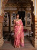 This is a hand woven floral zari saree in pure kota silk fabric. This pink color saree is having a banarsi touch and comes with a matching blouse piece.