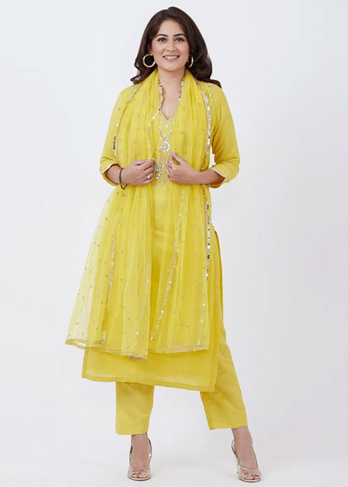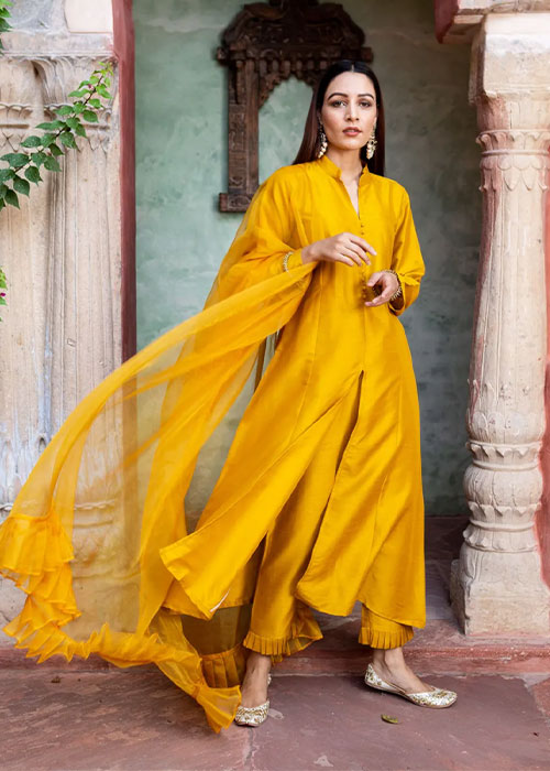 If there’s anything to take away from Deepika Padukone’s wardrobe, it would be her love for a good old monochrome look. While her off-duty wardrobe is filled with pastels and neutrals, the star’s festive side makes a case for bright hues. Take note of how Padukone’s otherwise-basic straight kurta and churidaar set stands out for its eye-catching sunshine yellow tone. The head-to-toe mustard look was offset with statement blue stone earrings and a muted makeup look, which would be ideal for any puja in the upcoming months.
