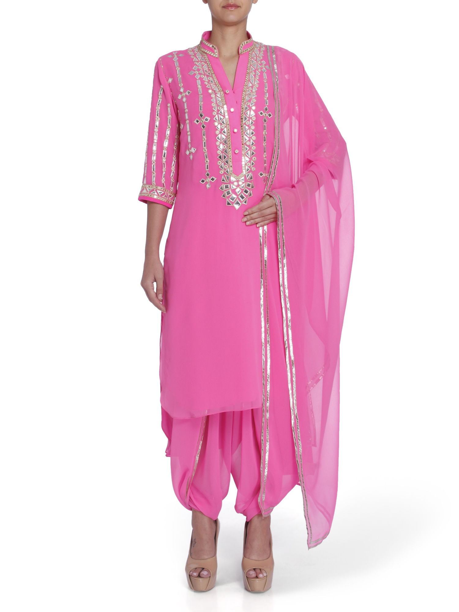 Gota Emb Front Short Back Long Kurta With Dupatta & Memoni
