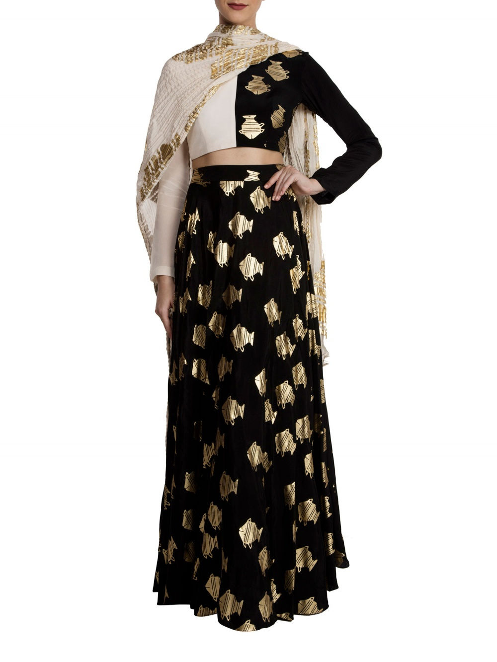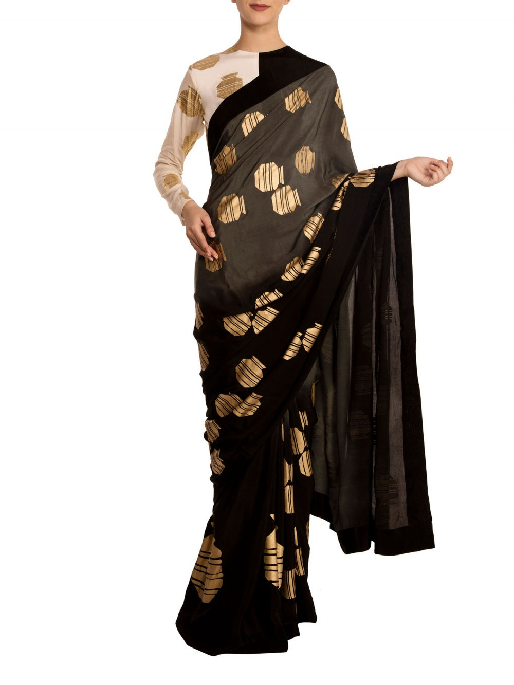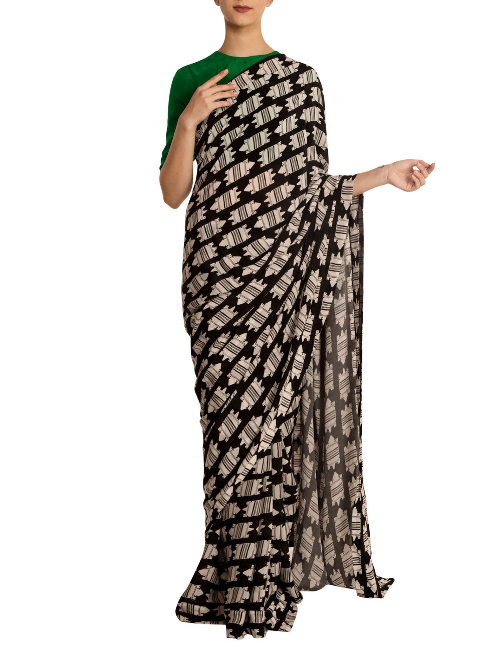 Swara’s saree features a black and gold banana leaf print with a matching short-sleeved blouse by the same designer. She teamed the look with a stunning kantha choker and rings by Amrapali Jewellery, and finished it off with a sleek hairdo featuring a centre parting. Her simple makeup done by award-winning artist Aarti P. was the perfect compliment to her outfit. Whatever you may call this young actress, you can certainly never call her boring.