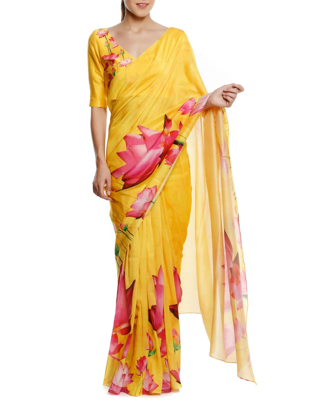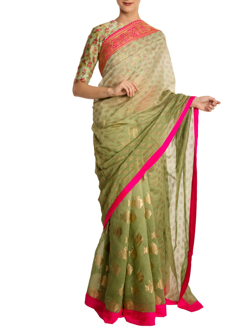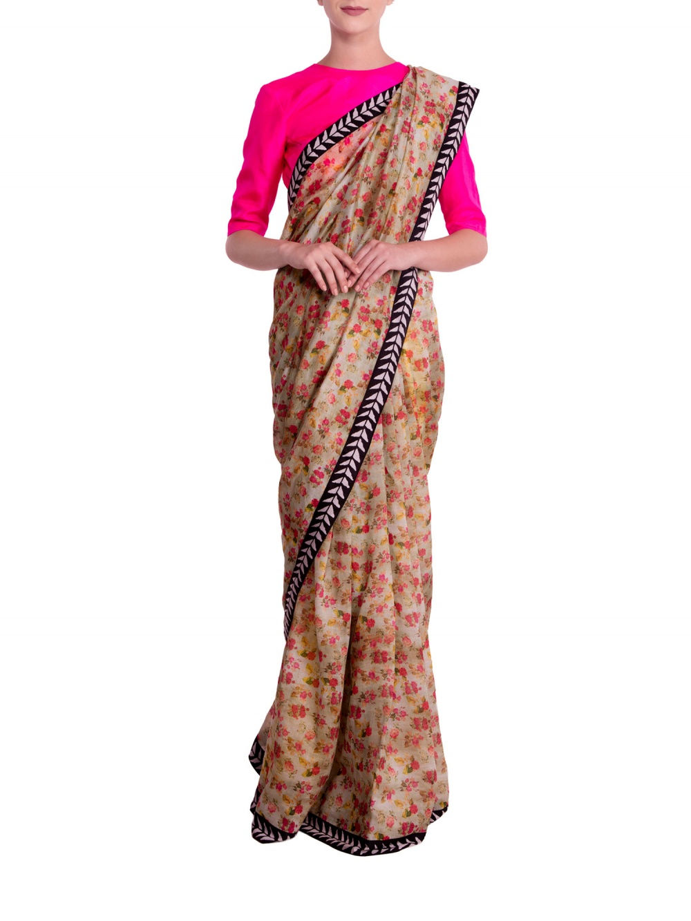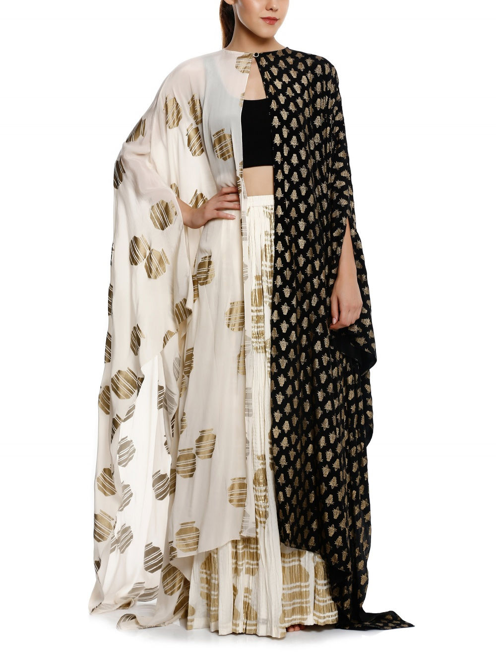 Swara’s saree features a black and gold banana leaf print with a matching short-sleeved blouse by the same designer. She teamed the look with a stunning kantha choker and rings by Amrapali Jewellery, and finished it off with a sleek hairdo featuring a centre parting. Her simple makeup done by award-winning artist Aarti P. was the perfect compliment to her outfit. Whatever you may call this young actress, you can certainly never call her boring.