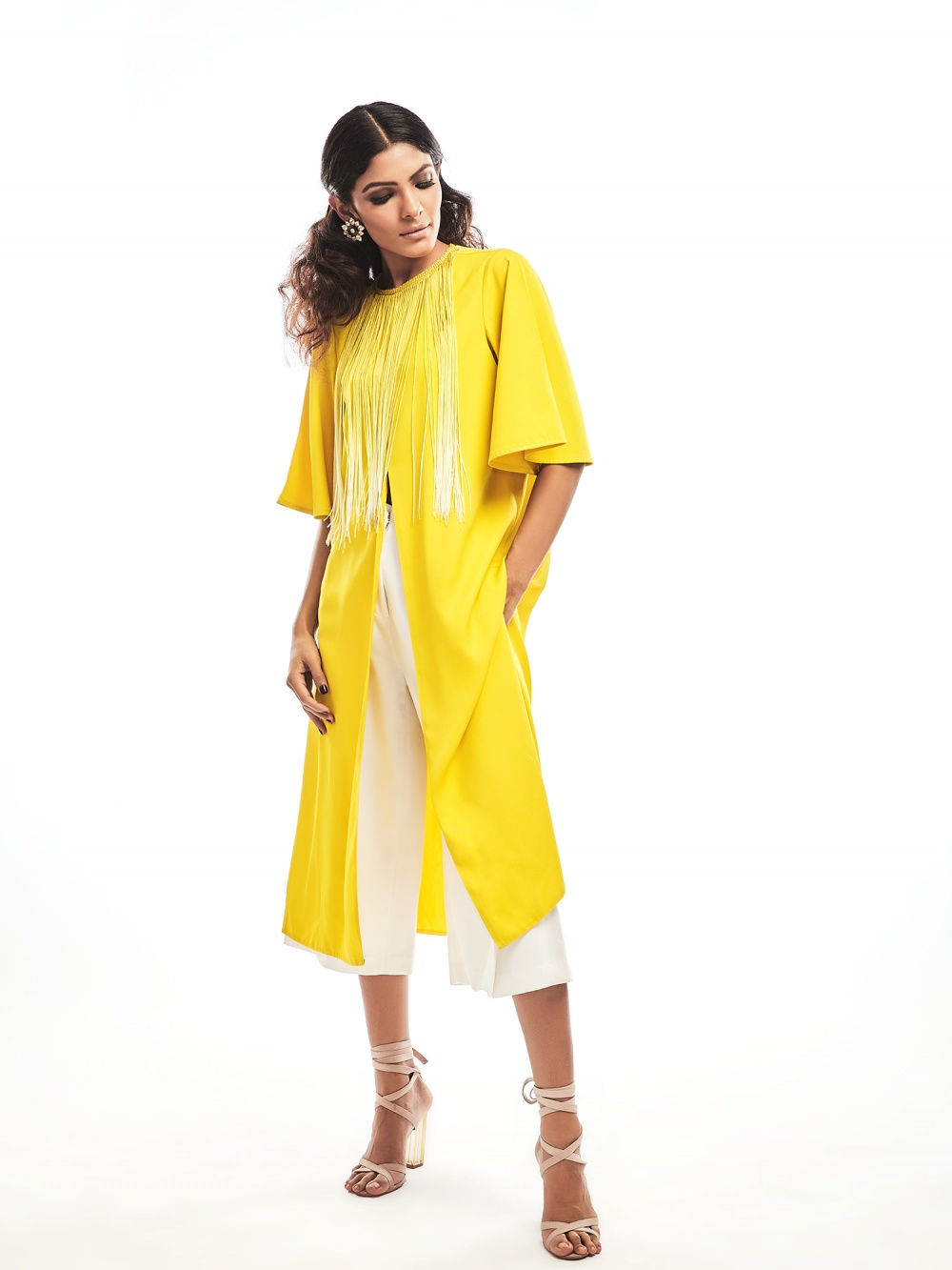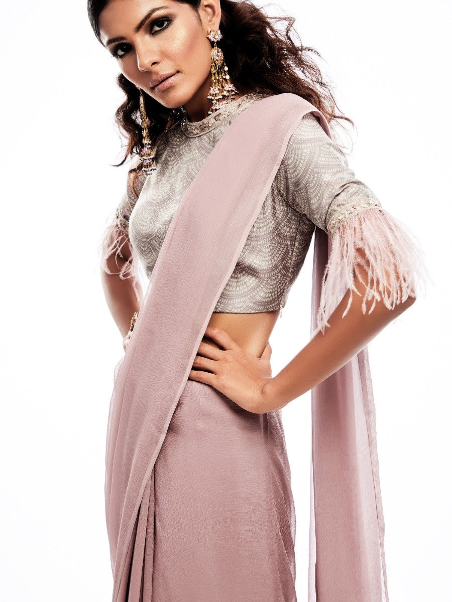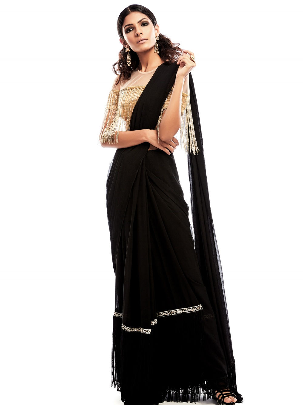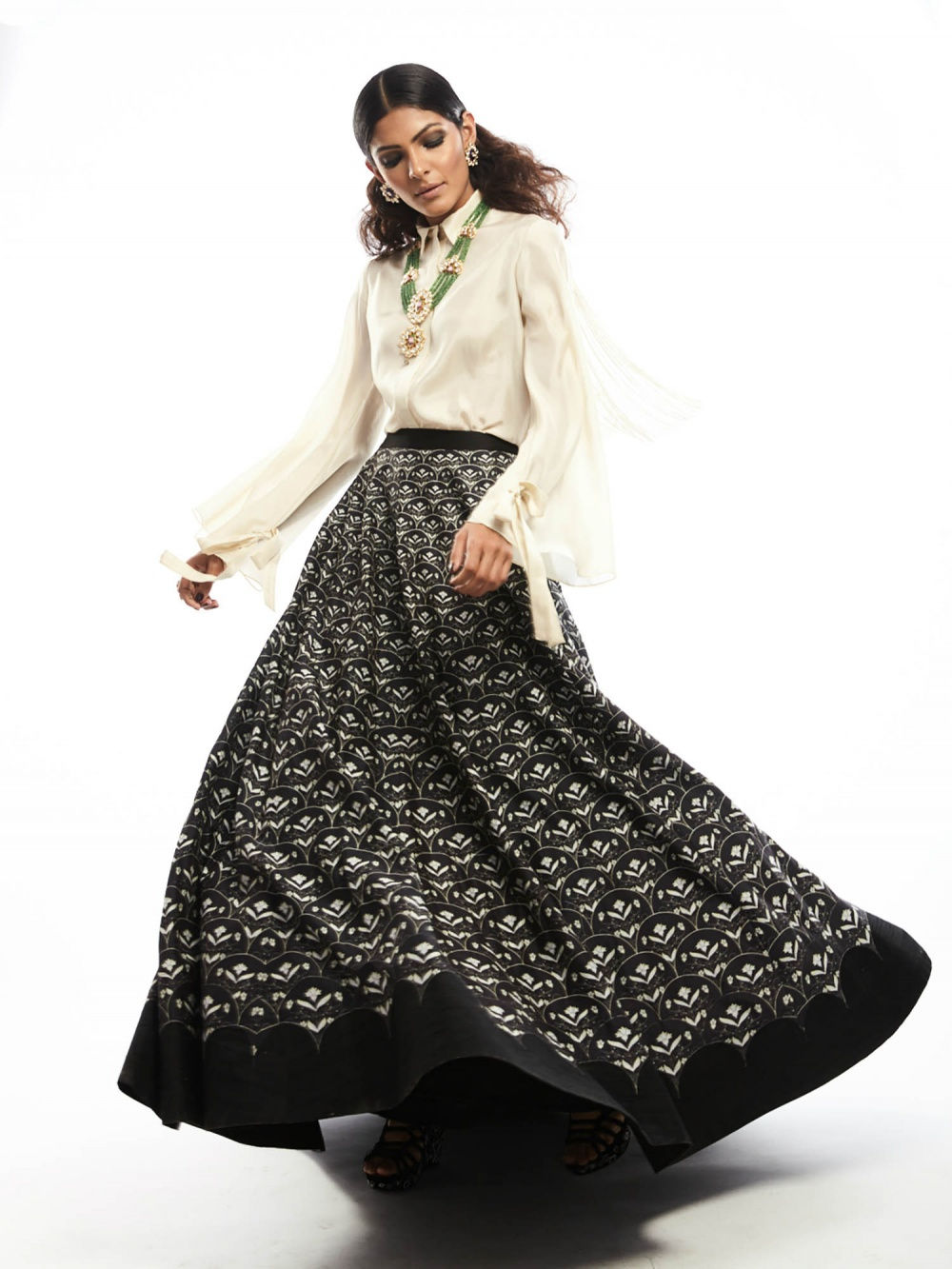 Taapsee chose designer Ridhi Mehra for the occasion, styling a black and white top featuring her trademark feather tassels with a flowy lehenga-style skirt. She finished the look with a pair of ethnic earrings by Azotiique and a simple yet elegant bun. This young star is definitely acing the fusion game right now.