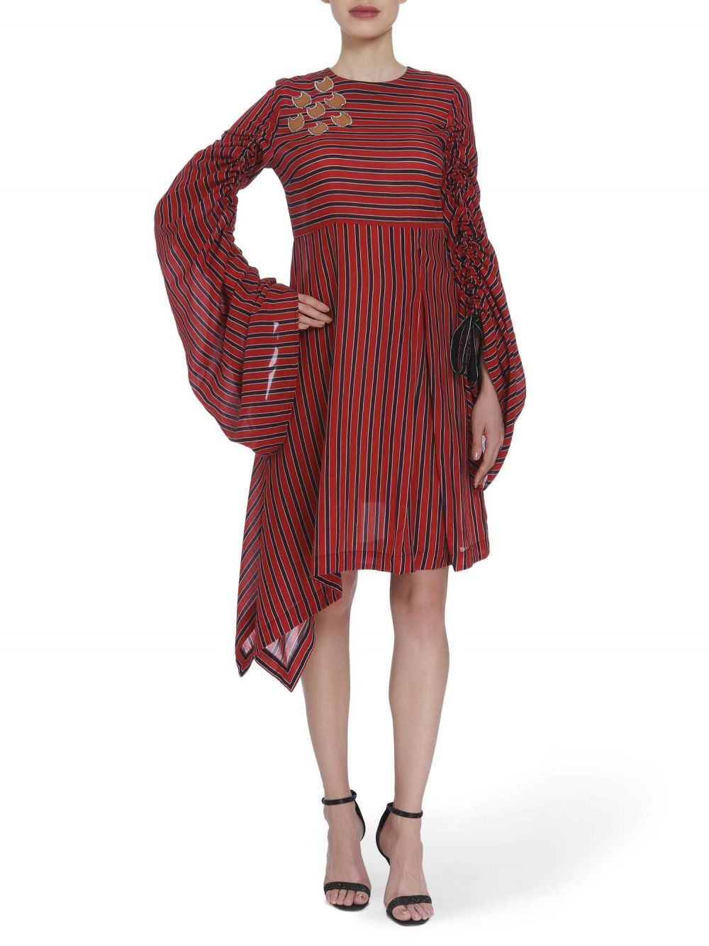 A nod to the urban wardrobe, Dhruv Kapoor brings to fore a collection that combines pop and romanticism without any constraints. Utility and functionality are key elements- the three way trench coat featuring macro stitch details and high slits is testament. Large orals, ethnic patchwork print on Japanese silk, vivid magical stripes, industrial twills, and heavy-textured taffeta with handcrafted embroideries in pop colors complete the collection.