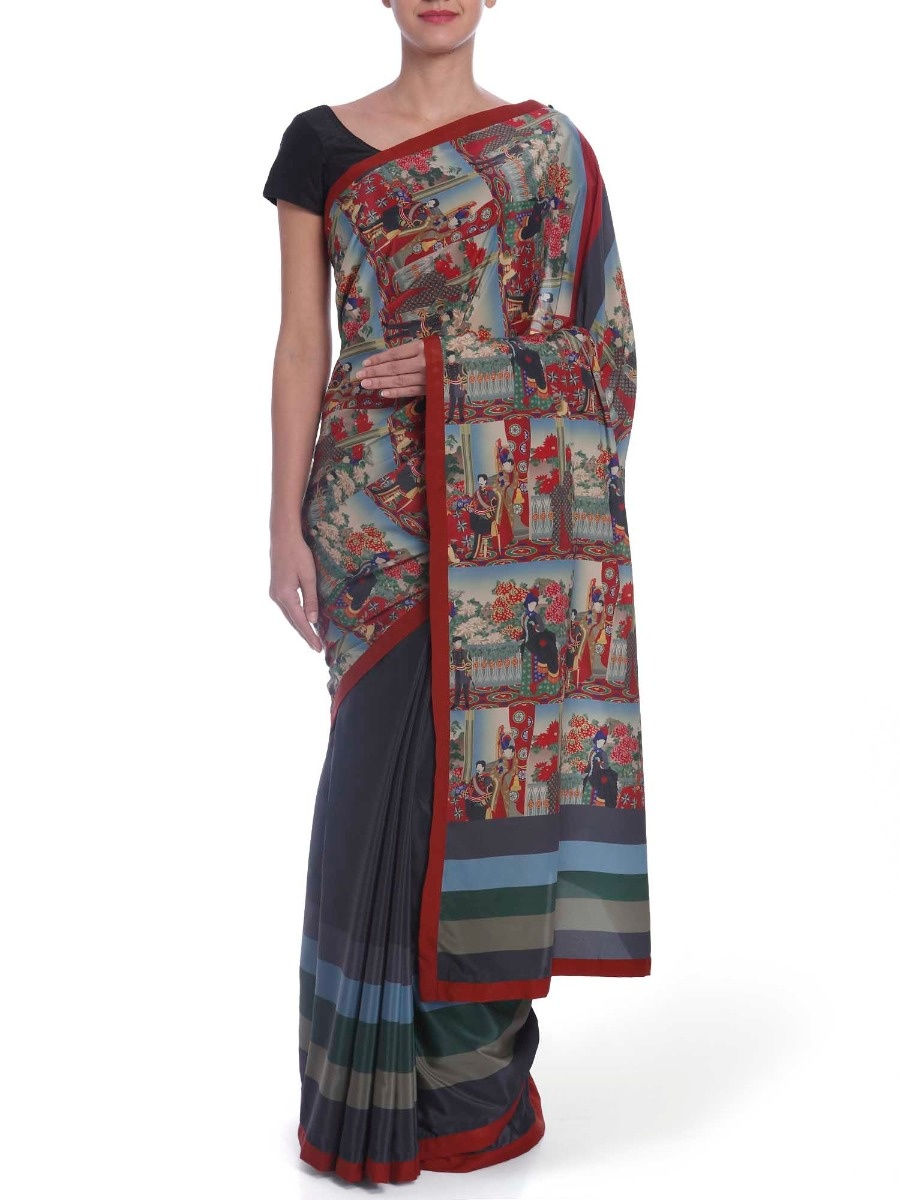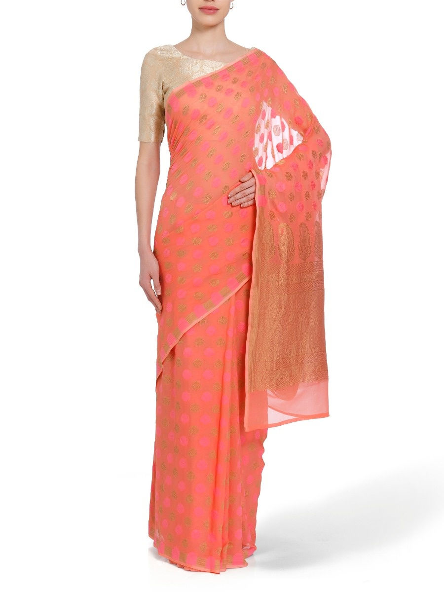 What’s a roundup of top 10 sarees without a chanderi masterpiece? Rajesh Pratap Singh’s collection ‘Welcome To The Jungle’ showcased this saree that looked absolutely breathtaking juxtaposed with a brocade blouse. The saree with intricate and skilled craftsmanship is just the statement piece your wardrobe needs for the decades to come.