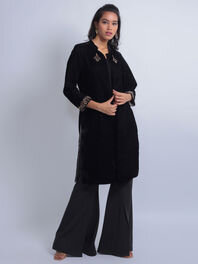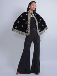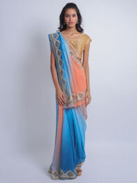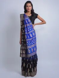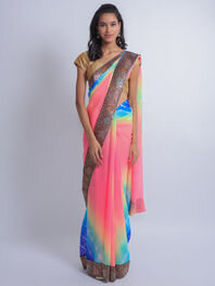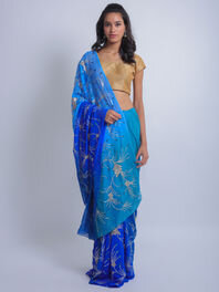The block prints we have featured are from Jai Kirti, the princess of Baria. She is known for her vast collection of block prints and her cottons that are the most long lasting and get softer with every wear. The capes in the collection are also from her – the embroideries on the capes are vintage motifs revived. Back in those days the royals would wear lightweight chiffon saris and when they didn’t want to wear a shawl, they would wear these capes which were adopted from the European royals. Then there are some beautiful leheriya saris with vintage borders – the leheriyas are tie-dyed and not printed. Even the ombre saris are purely hand dyed. You’ll also find chiffons with borders that feature some truly intricate embroideries and cut work – its where you burn the fabric in the desired pattern and then embroider around it. The pièce de résistance, however, is the black and blue sari with khadi ka kaam because of a very interesting backstory – all the royals in Rajasthan unfailingly wear black and midnight blues only on Diwali, and not on any other day.This is because it is Ekadashi, it’s a moonless night and there’s also a history of how the entire Jaipur dynasty got destroyed on the Diwali day so they wear it in solidarity to that. The sari in the collection is a museum remake of the original saris in the Jaipur museum.