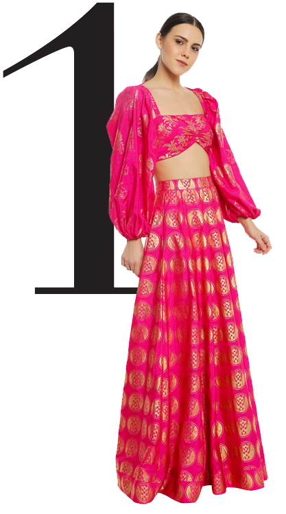This lehenga set by Masaba features her signature prints- a fuchsia bustier featuring the rabbit gold foil print along with a fuchsia lehenga with the corn stamp print and a balloon-sleeved shrug to match! – an absolute winner for destination weddings or festive evenings.