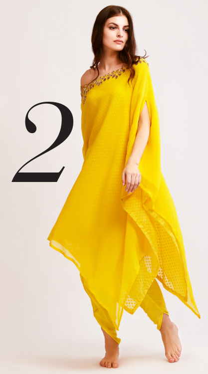 A failproof way to add vibrant touches to your festive wardrobe, this yellow floral chiffon tunic set by Amrita Thakur features an off-shoulder embroidered tunic with an asymmetric hemline and a chanderi lining. It comes with a pair of matching dhoti pants to form a flawless ensemble.