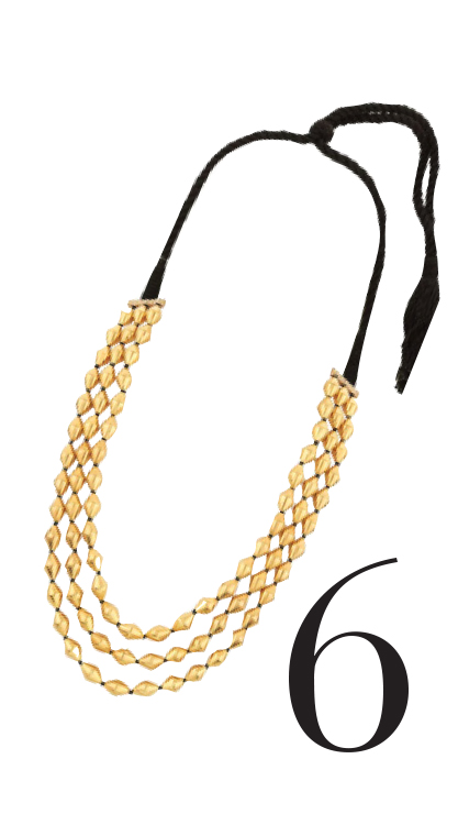 We bet this one’s a conversation starter- crafted in sterling silver, this necklace by Ahilya Jewels features dholki shaped beads strung together in an adjustable black cord. It’s gold tone and clean features make it a versatile must-have.