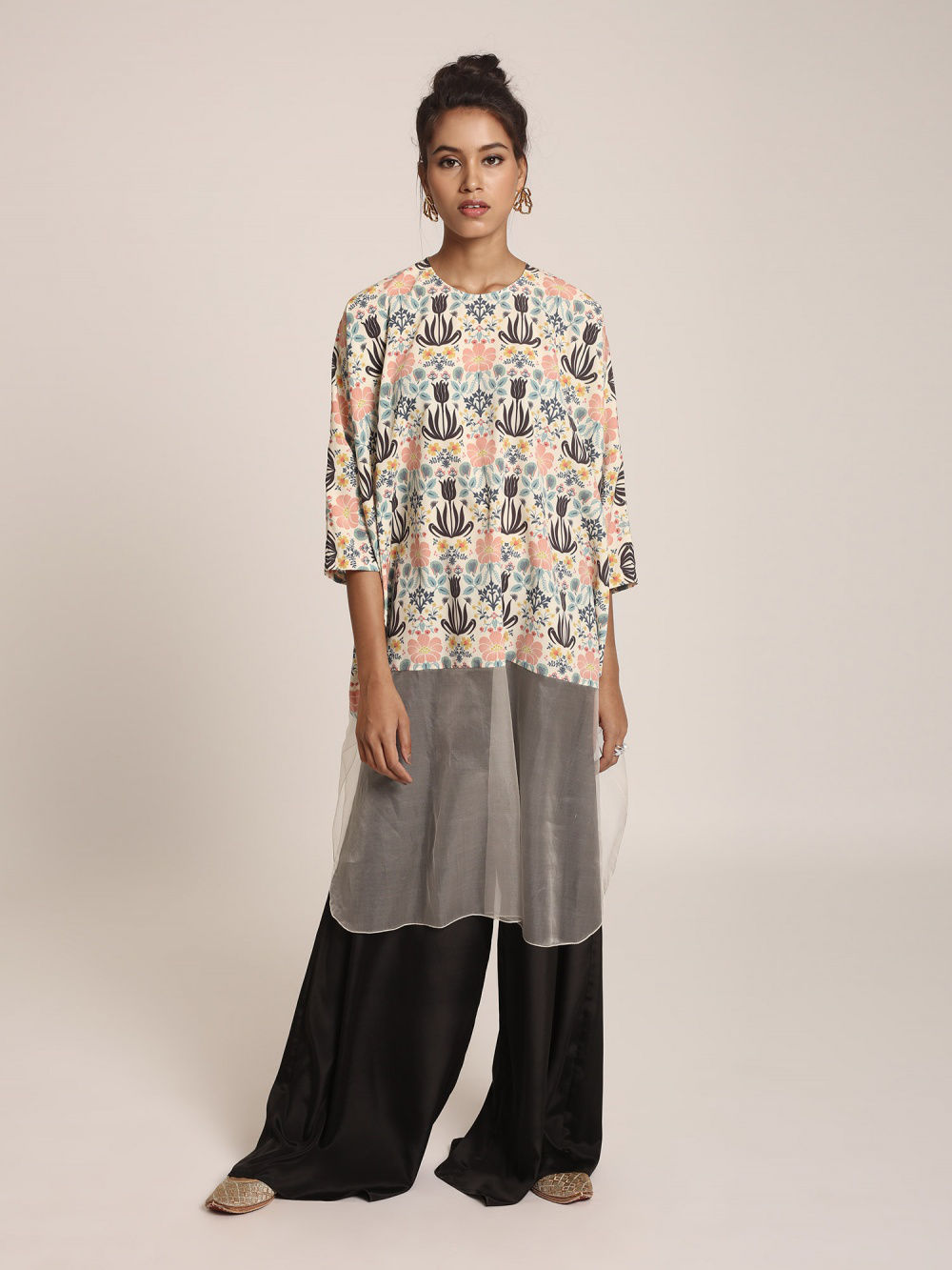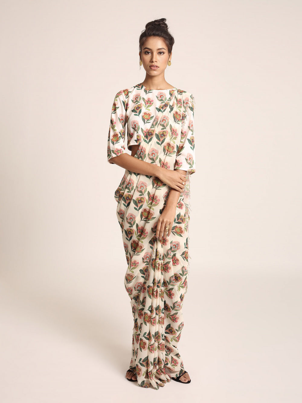 The prêt collection that we have done for Nykaa Fashion is a combination of our best-selling silhouettes with all our best-selling prints. The entire collection is crafted in poly crepe to make the collection an affordable one because the biggest cost that goes into making all these garments is the pure fabrics that we use. Another advantage of poly crepe fabric is that it makes the garments washable at home. In terms of silhouettes, you’ll see all our comfort styles which have become popular like the dhoti saree or the low crotched pant – pieces that are great wardrobe staples.