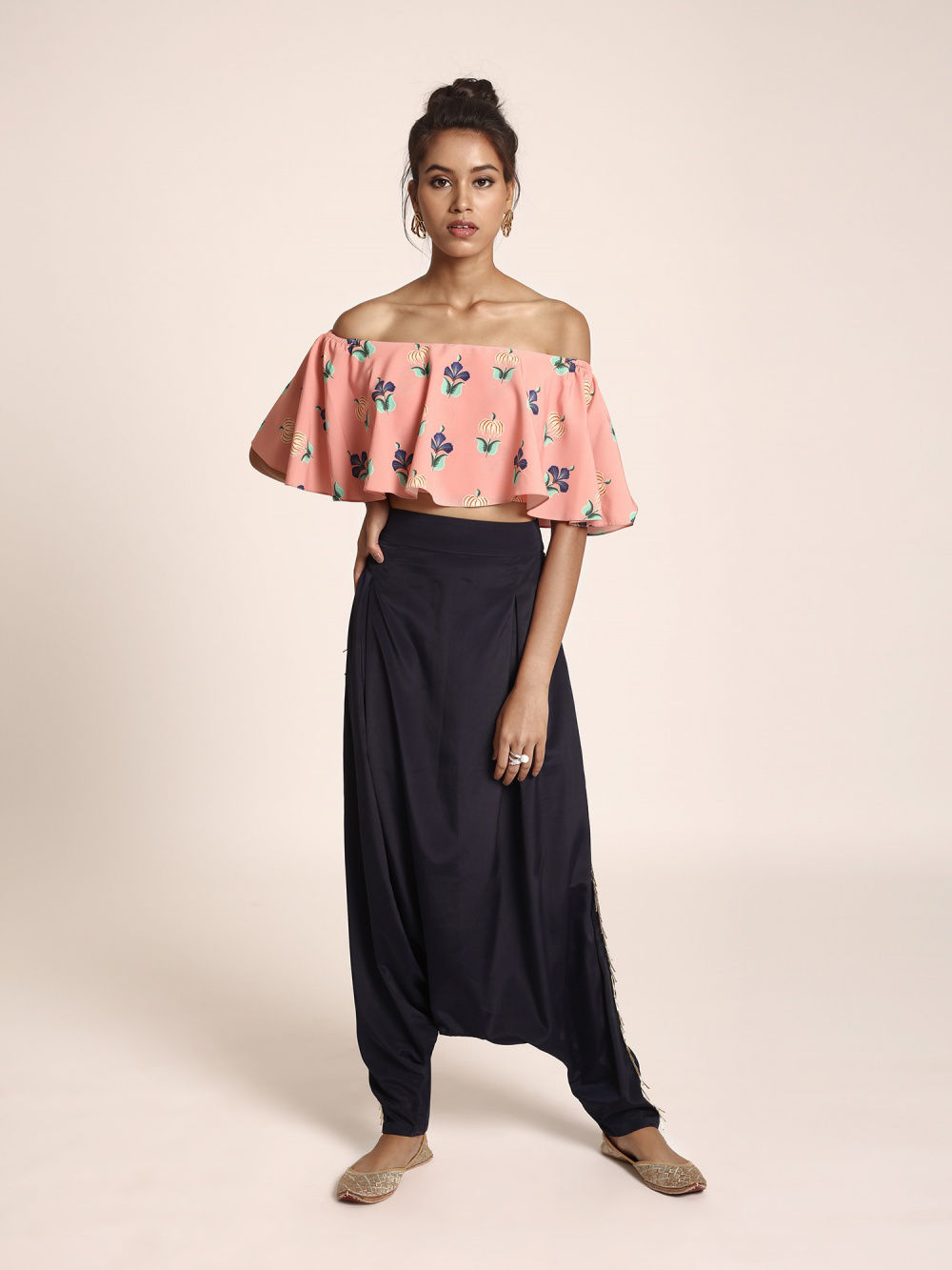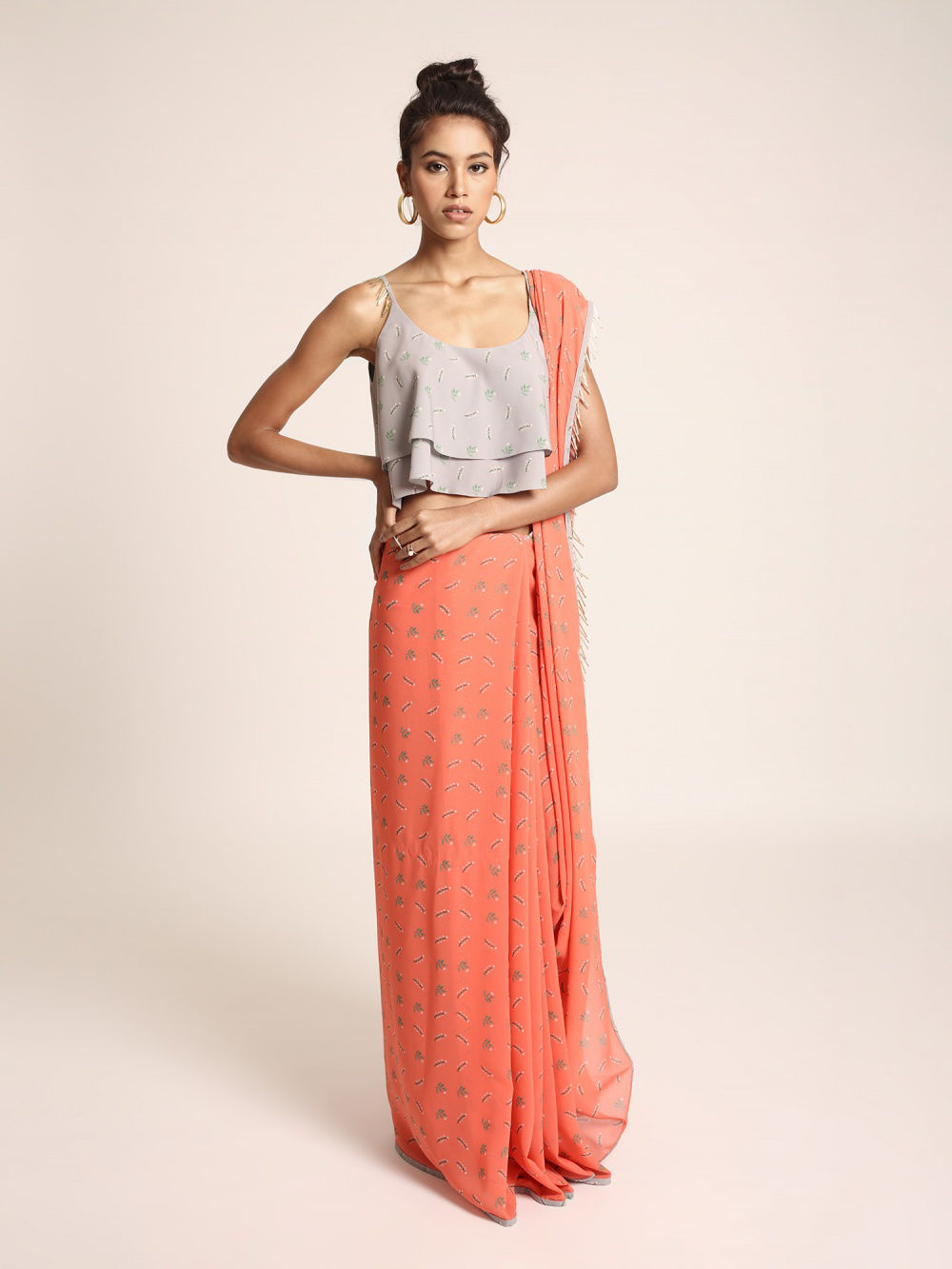 I would say our best-selling silhouette which is our crop tops with dhoti sarees. It’s such a fun silhouette because anyone can wear it; right from a young girl going to a college-going teen to a married woman with a young baby to manage. It’s such a versatile silhouette, it’s super comfortable, it’s very easy to wear, it’s something which a lot of body types can wear, and you can dress it up or down.