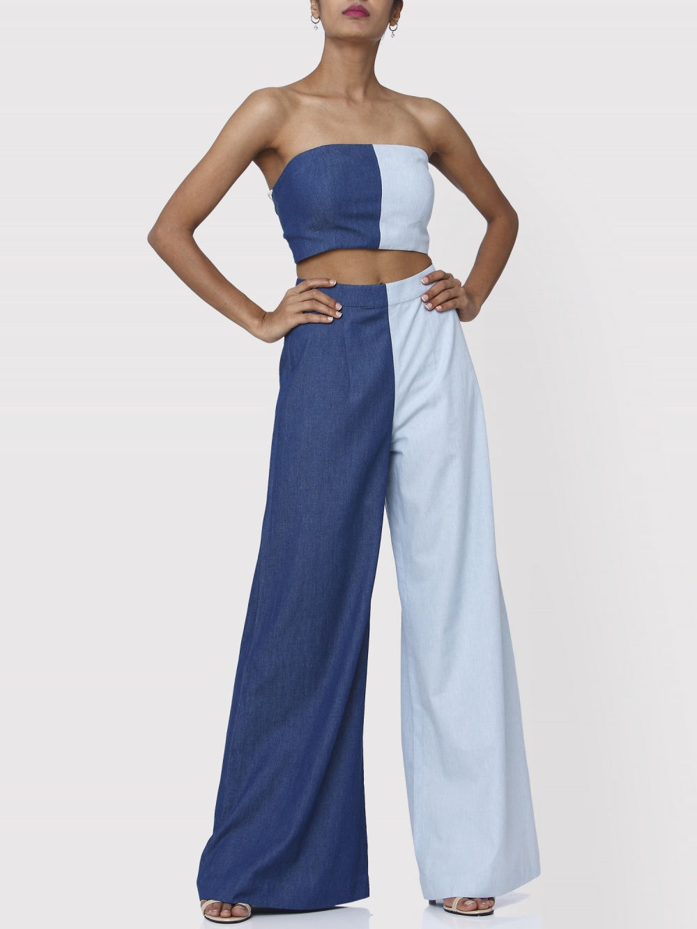 For a brunch date, dress this denim number down with a pair of white distressed jeans and for dinner, dress it up with black flared bottoms.