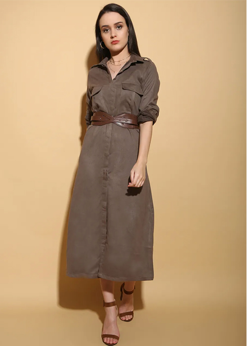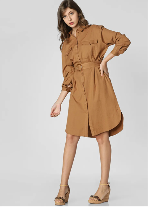 Your closet is incomplete with a belted shirt dress, preferably in tan. Dress this dress up with some thigh high boots and you’re good to go.