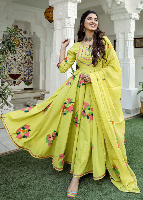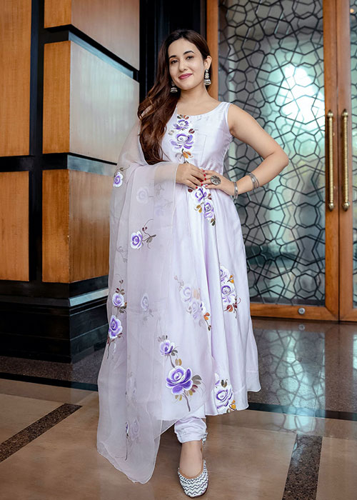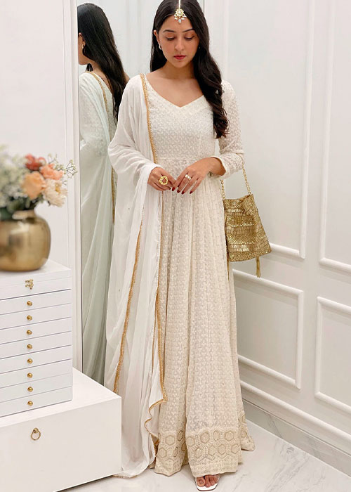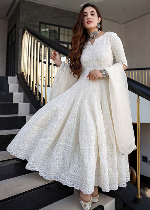 A statement ivory chikankari anarkali or a hand painted one? Why choose. Style your look with a pair of chaandbaalis or a paasa.