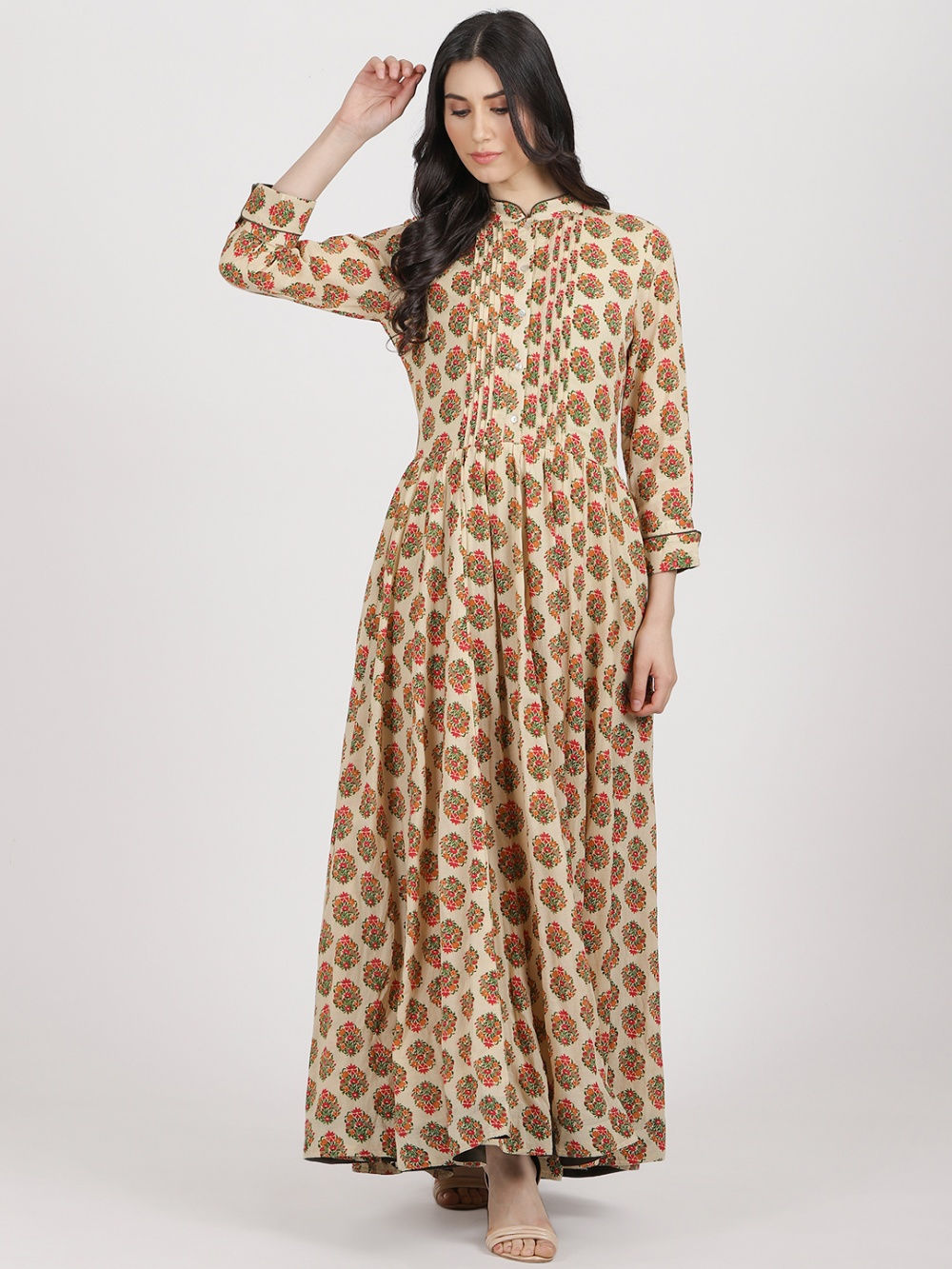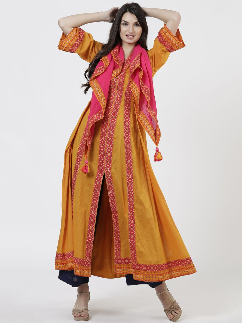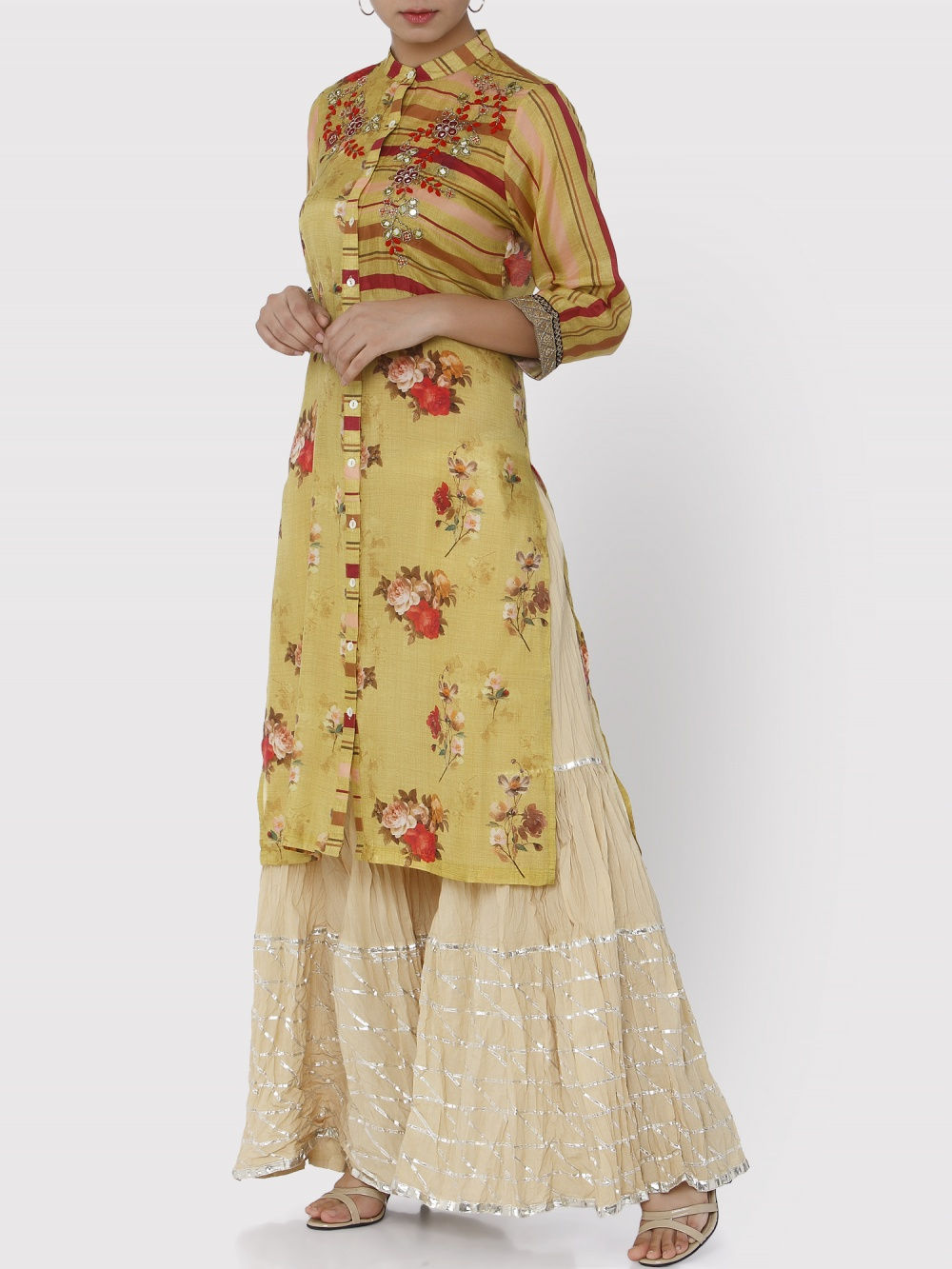 When it comes to experimenting with Indian motifs, one can never go wrong with Ritu Kumar – be it this bell sleeved pastel kurta with oversized circular prints, this bottle green kurti with marigold prints or this long kurta boasting a typically kitschy avatar with it’s pastiche of prints – we bet, you’ll be spoilt for choice!
