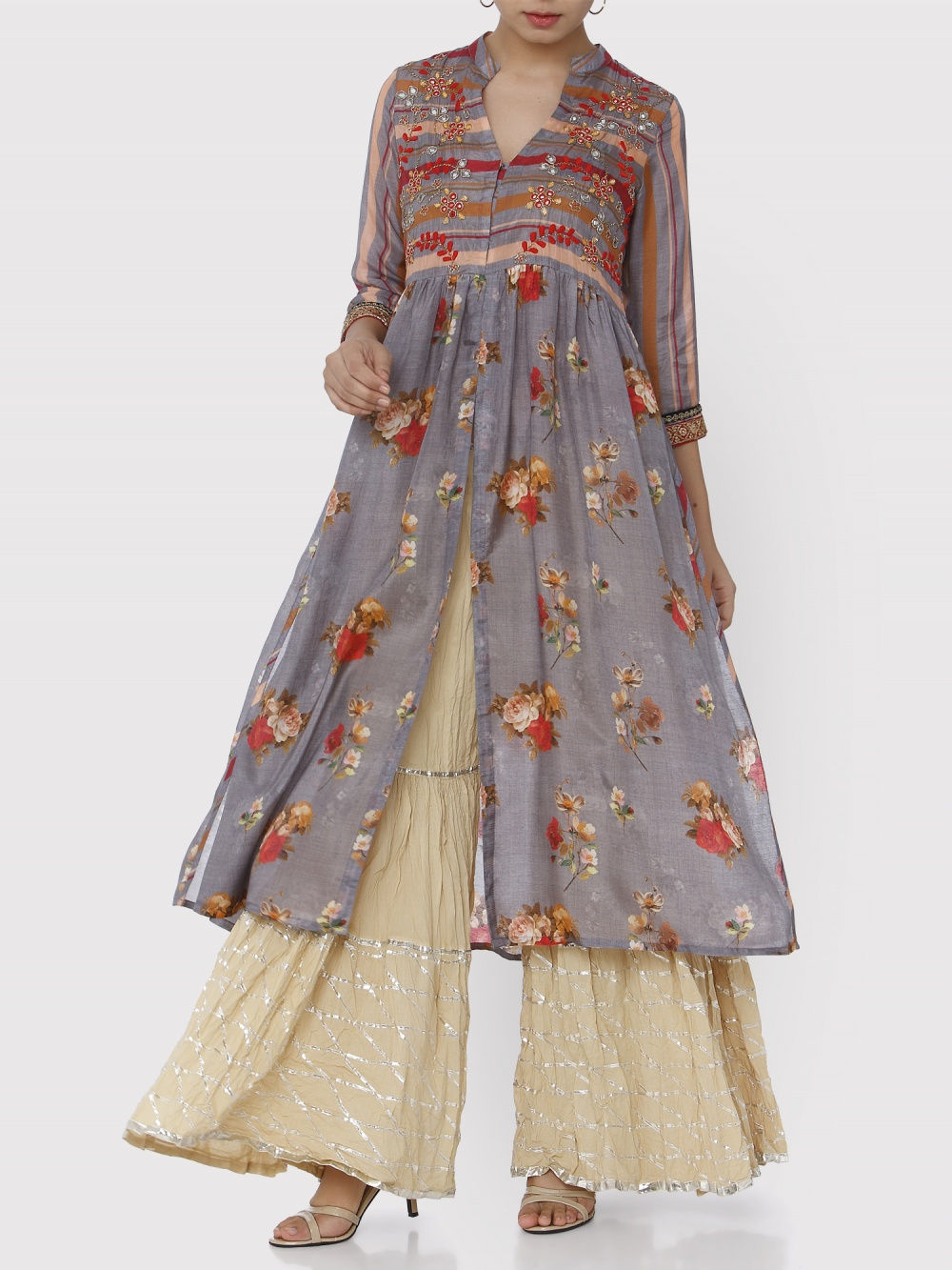 While floral prints are a classic, this season, trust Gopi Vaid to do them right- micro and macro, both! Our top picks? This byzantium asymmetric tunic featuring just the right amount of macro-florals, this pastel pink tunic with pristine floral and leaf prints and this greyish-blue kurta with vibrant florals and a handkerchief hemline.