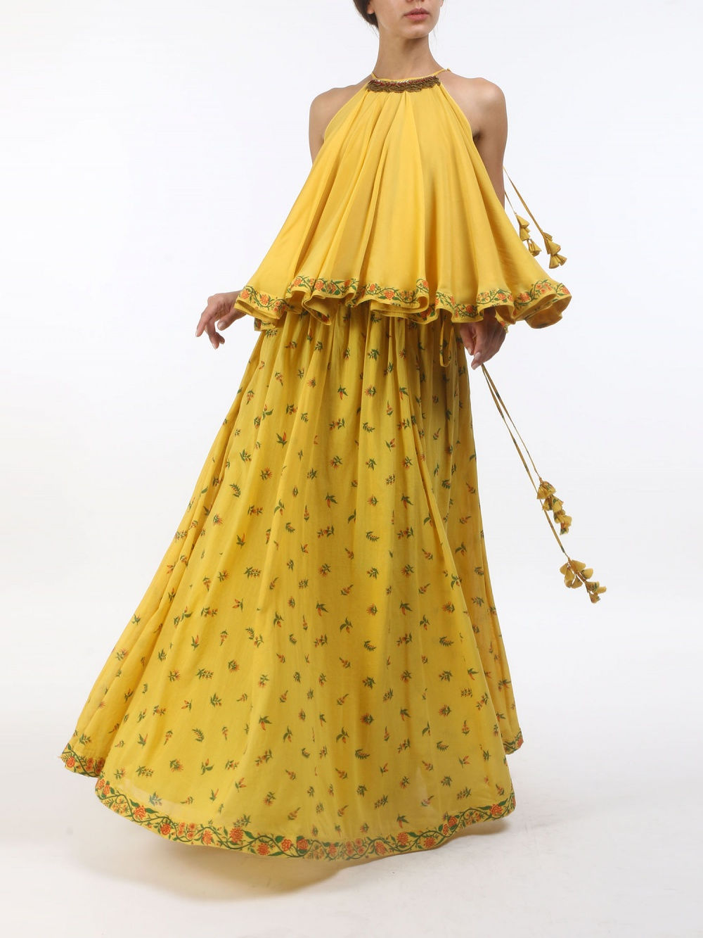 This season, Nikasha gives a crash course in flaunting dainty florals and micro prints – for instance this flowy anarkali featuring mini florals mishmashed with life sized floral prints on the dupatta, or this pastel green kaftan and sharara with tiny florals all over. For us, the one shoulder top with floral foil prints takes the prize for channelling two of the hottest prints of this season in one go!