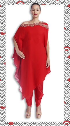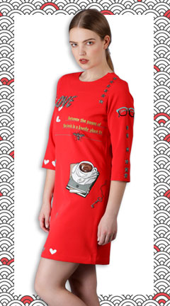 Brunching with your girls is a gala affair, so let that spirit reflect in your attire with this hip red dress with cool slogans and embroideries by Shahin Mannan. To add to it, it helps that there’s a cup of