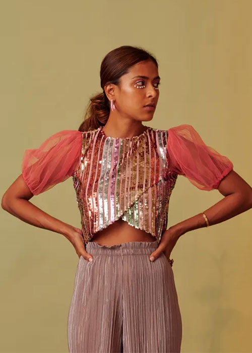 This embellished, balloon-sleeved crop is exactly what you need if you’re looking to add a pop of colours to your solid drape, this Diwali.