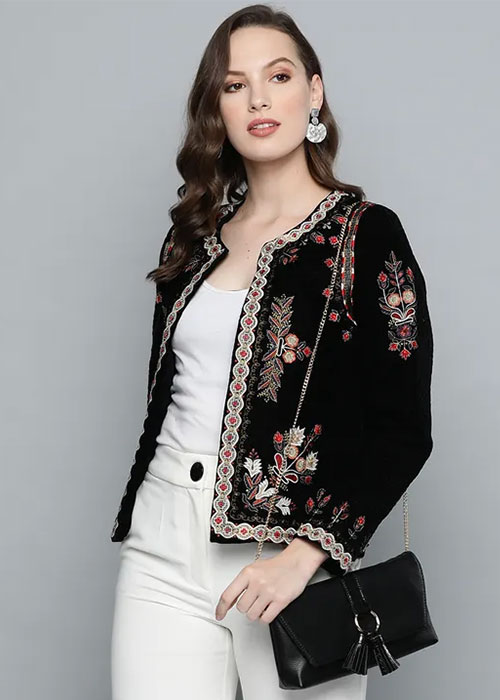 Keep your look regal in this embroidered, velvet designer jacket that is the ultimate layering essential you need, this wedding season.