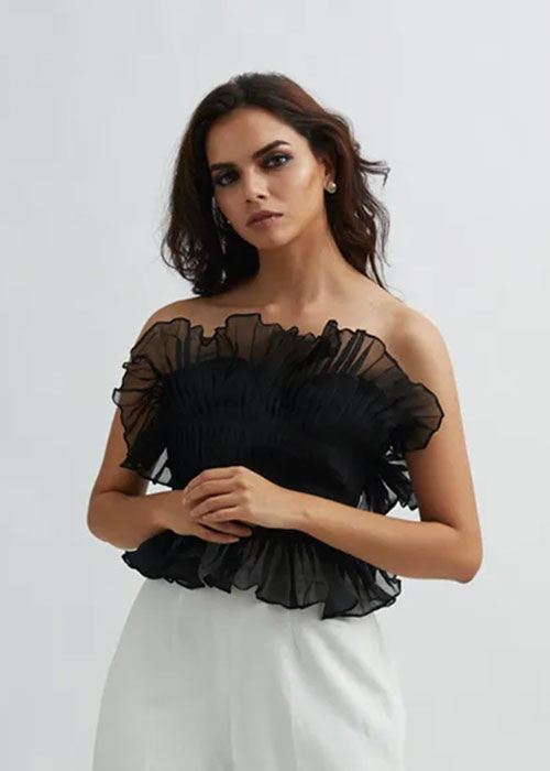 Add a dramatic yet minimalistic vibe to your drape with this organza, strapless top that looks tailor-made for wedding cocktail events.