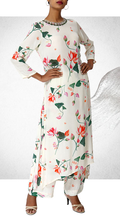 You’ll never have a dull-day with a delicate infusion of florals in your wardrobe, especially if it’s this easy piece from Arpita Mehta. All you need is a pair of heels and a bedazzled clutch to let your inner diva come through!