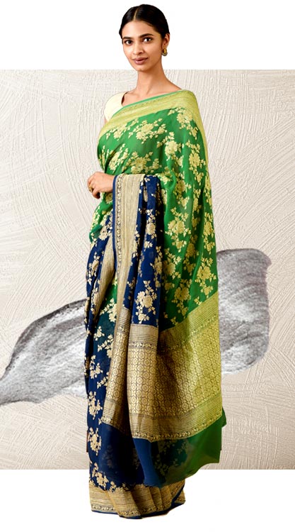 You must agree that a wardrobe without the quintessential six-yard drape is an incomplete one. The vibrant colours of this saree paired with Ekaya’s meticulous finesse in hand-woven Banarasi textiles makes it a compelling collectible. Polish it up with some avant-garde trinkets to up the ante.