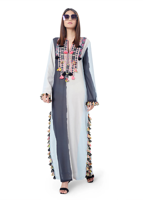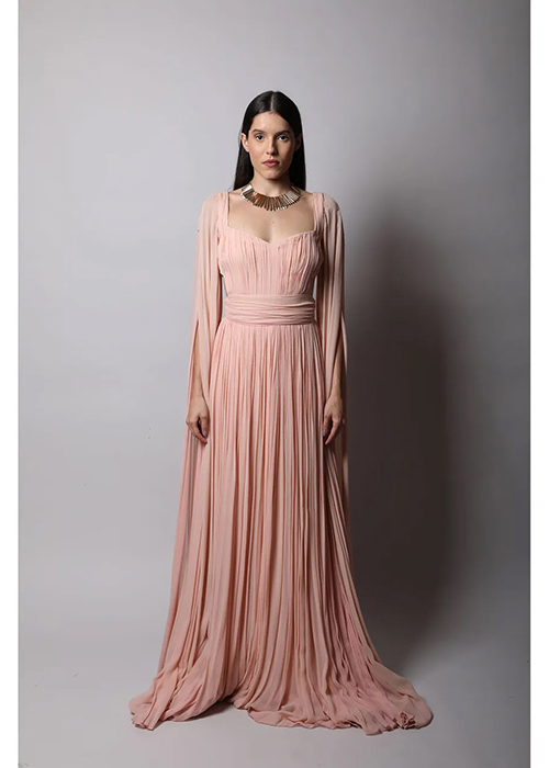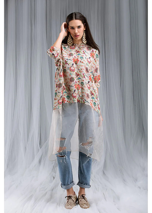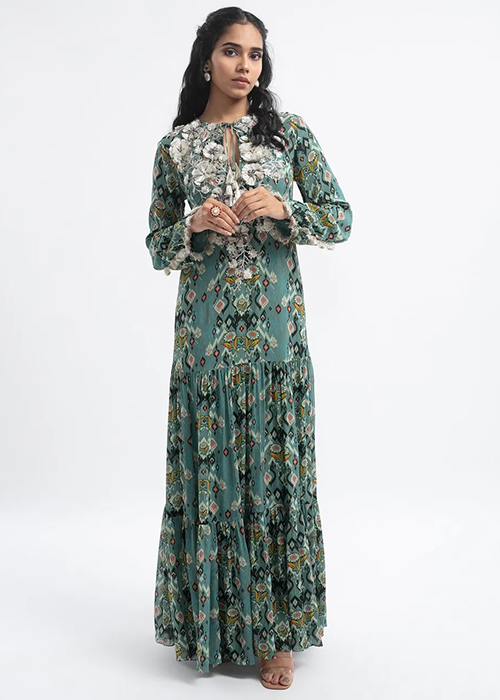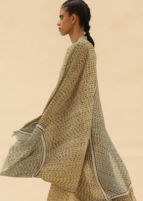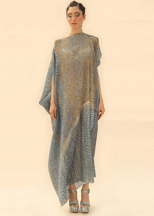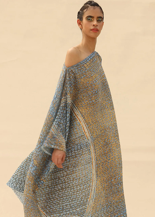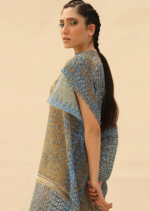 Abhishek Sharma’s drapes take on a life of their own. The shapes are reminiscent of sails or modern architecture. Each drape is placed asymmetrically across the body to stunning effect. Tie-dye prints add textural appeal while the georgette base makes it perfect for all weather.