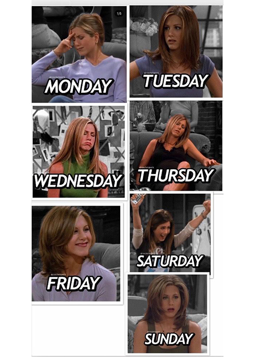 90s fashion icon Rachel Green has served us with lockdown looks for every day and every mood. Take cues from her green turtle neck for work calls and her printed tee for FaceTiming friends.