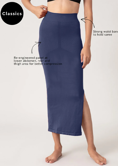 Nykd’s saree shapewear has been designed with focused compression on the side of the hips to tuck them in firmly. These areas converge at the centre with ease for your saree pleats to flare with ease. All of these combine to compress any muffin tops or side bulges, giving you a defined and sculpted shape. The side helps you move comfortably, so nothing gets tangled at your feet.