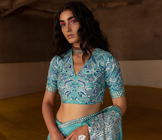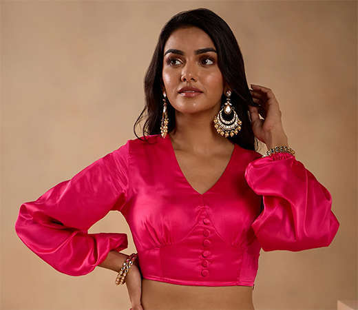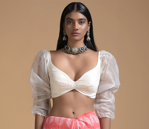 For those of you who are seeking a classy and sophisticated look, opt for the timeless full-sleeve blouse. Fashion icons like Deepika Padukone and Priyanka Chopra have often been spotted sporting full-sleeve blouses with sarees. This style keeps you cosy while exuding grace and poise. To achieve their look, pick rich fabrics like silk or velvet, and consider minute details like intricacy in the embroidery or embellishments on the sleeves for a touch of glam. Look sophisticated without compromising comfort by opting for net or organza for full sleeves. Perfect for summer weddings, for hair, you can wear it open and accessorise with a choker necklace and earrings. Switch bangles for a bracelet to let the full sleeves show. You can also opt for plain solid colours and simple designs for an office event.