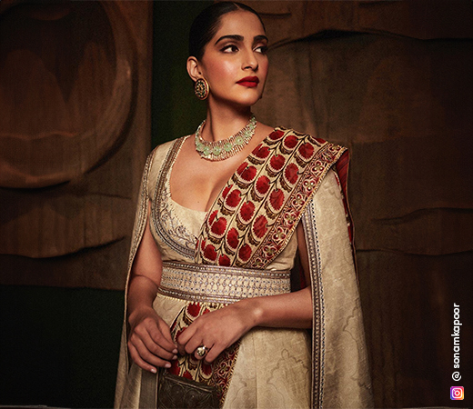 Cape sleeves are inspired by the Mughal era and are all about drama and regality. It is basically a layer of grandeur added to your attire. This blouse is a game-changer, and make sure you pick heavily embroidered capes for a royal look. Opt for deep jewel tones like emerald green, wine purple, and royal blue. Go for intricate gold jewellery sets for accessories, you can also wear a kamar bandh and maang tika. Complement the look with bold eyes and lips and highlighter on the high points of your face. You can also get this look by adding a separate cape to your regular blouse. Capes can be added to lehengas and sarees – like the stunning Sonam Kapoor.