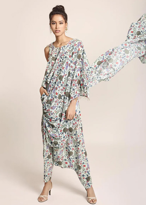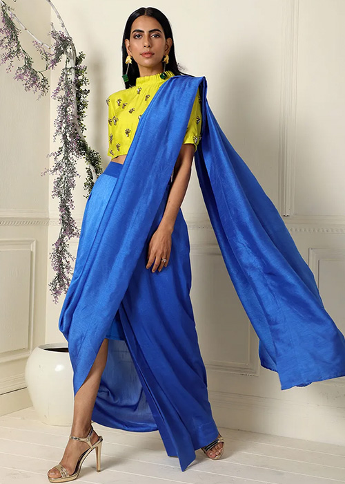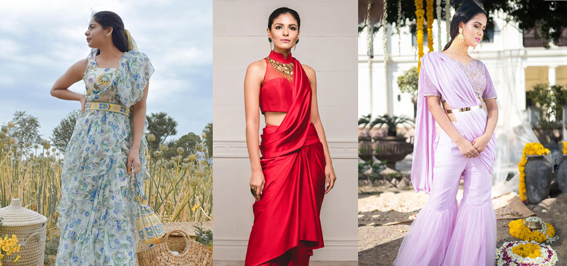 Whether it’s something as classic as a Benarasi weave or a sari covered in intricate embroidery, the six-yard staple has the superpower to make you stand out. But for those of you who already have a slew of saris in your wardrobe, we’ve rounded up the most unconventional iterations that you should stock up on for the festive season. Think the kind with sharara pants, sari-gown hybrids and more. Scroll down to shop our favourite finds.